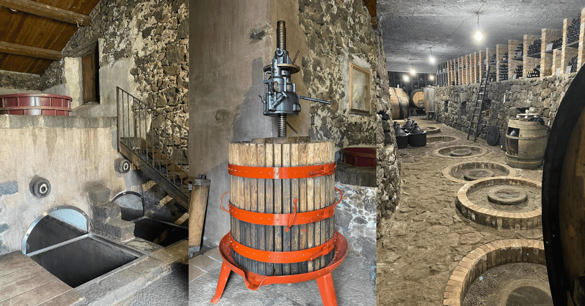 Palmento 是西西里島當地特有的酒窖建築,主要以黑色熔岩及石塊構成,用來釀酒和儲藏,特色為建築物中有三到五個樓層或高低位置交錯但相連的凹槽,以自然重力來引流不同階段或型態的未發酵葡萄汁 (Must),同時最後讓未發酵葡萄汁得以引入選定的容器中進行發酵或培養。